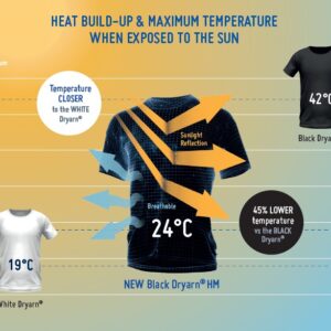 For warmer seasons, Dryarn® should preferably be used with garments made from hydrophilic fibres, such as cotton or nylon, that can absorb the moisture from base layers. However, a Dryarn® garment would perform even better, as it would move this moisture towards the top or jacket lining, for a dry, comfortable feeling.